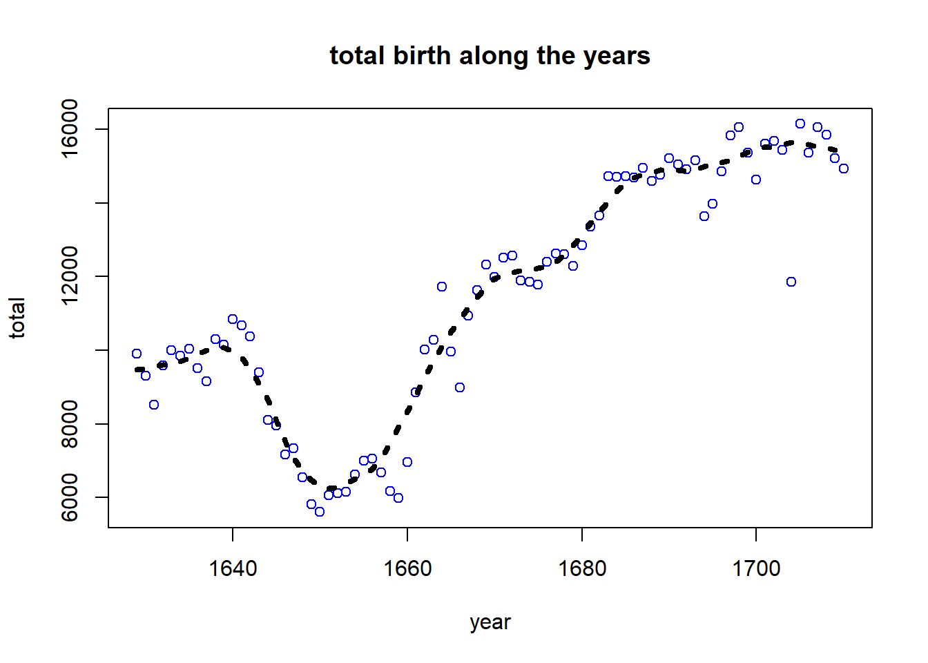 lines(year,lowess(total,f=1/6)$y, lty=3, lwd=4)