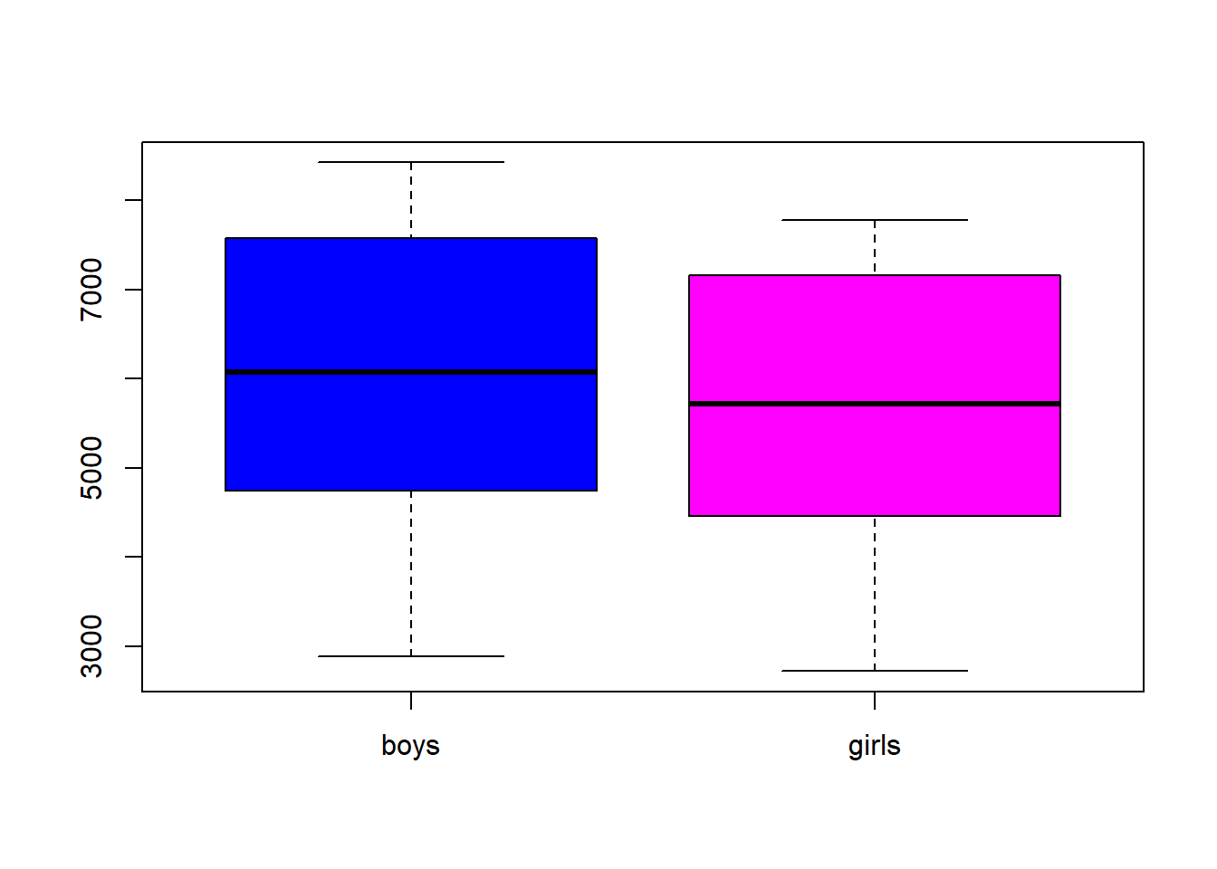 boxplot(boys, girls, names=c("boys","girls"), col=c("blue","magenta"))