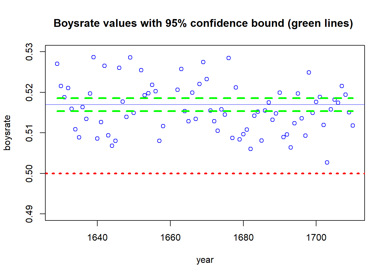 plot(year, boysrate, ylim = c(.49,.53), col="blue", main="Boysrate values with 95% confidence bound (green lines) ")