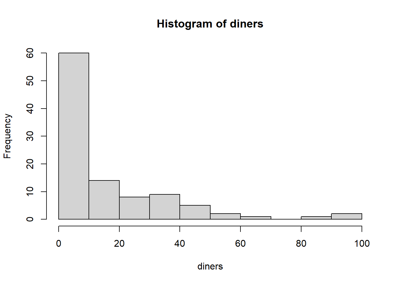 summary(diners)## Min. 1st Qu. Median Mean 3rd Qu. Max.