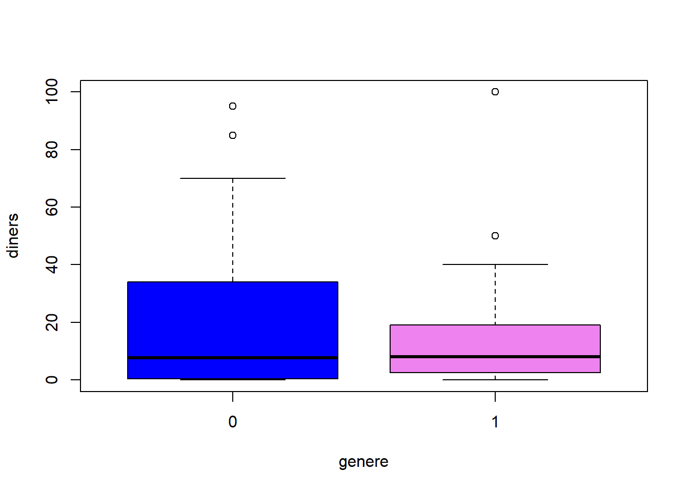 boxplot(diners ~ genere, col=c("blue","violet"))