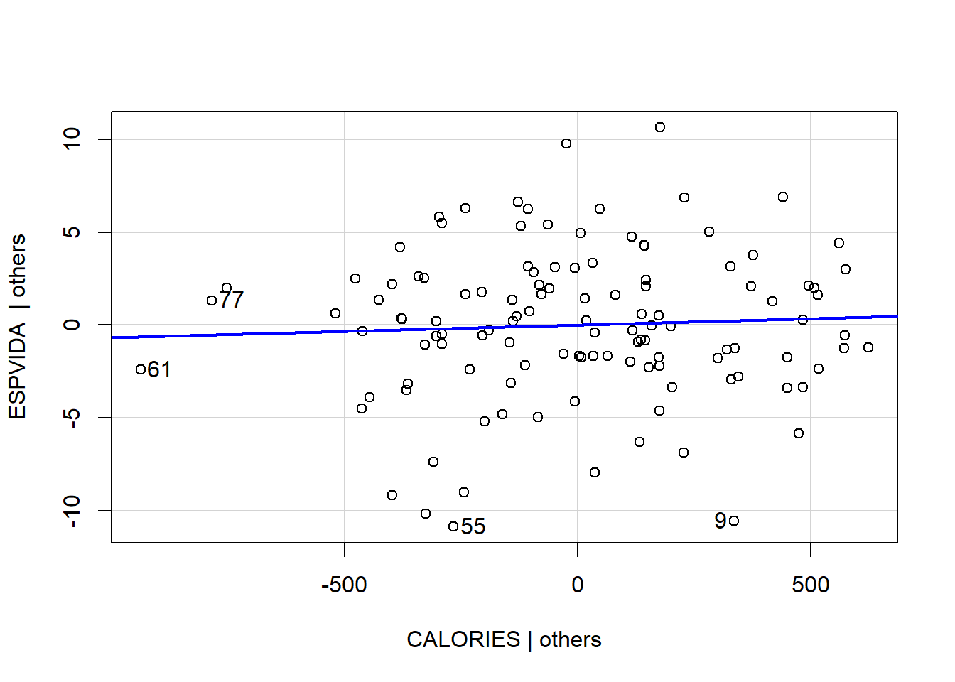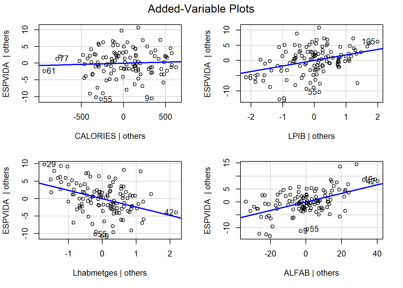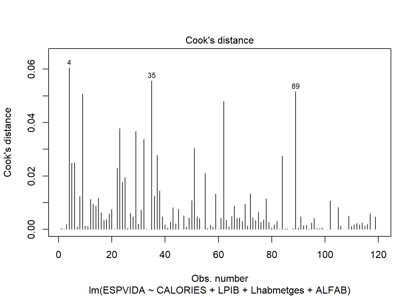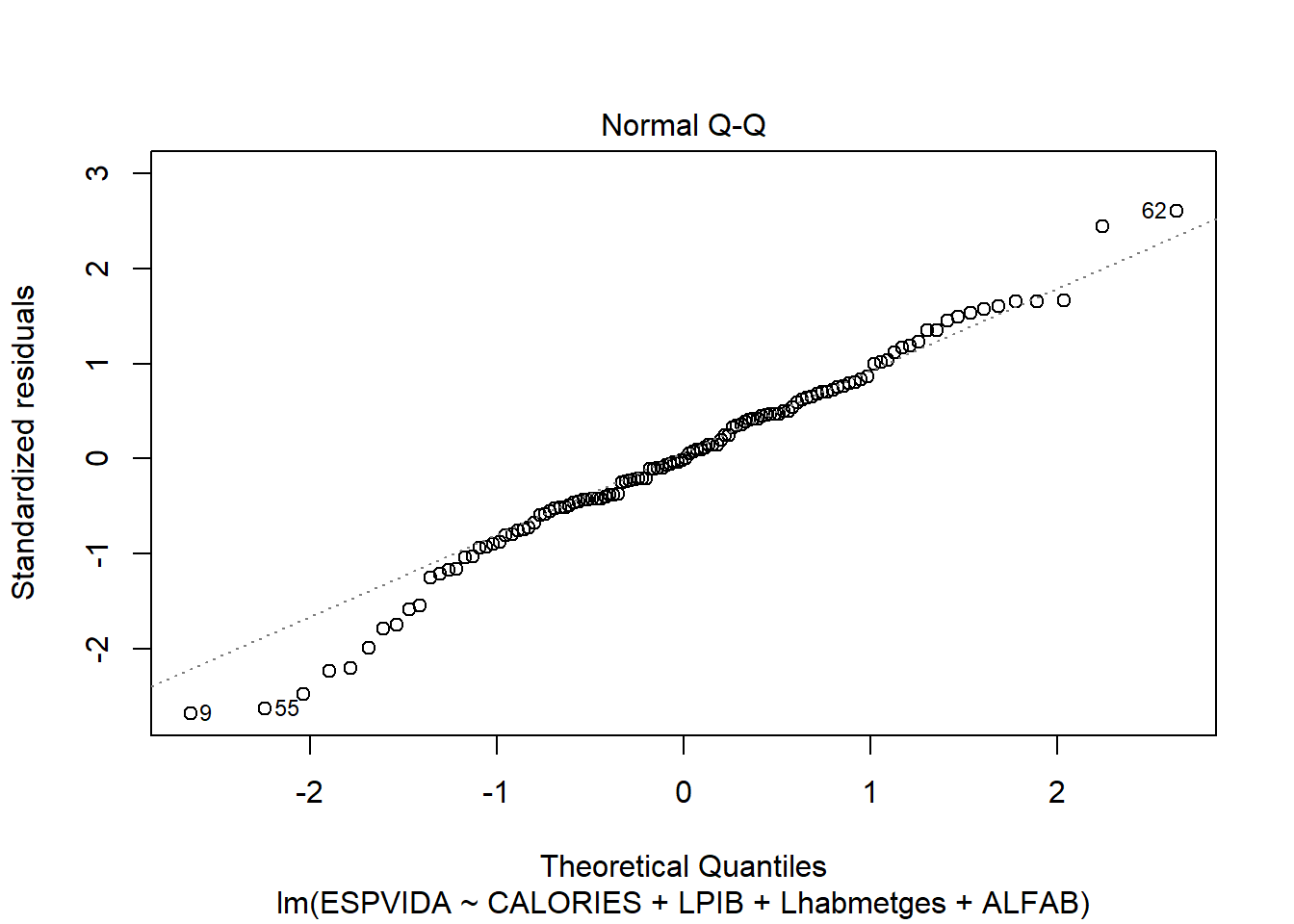 reg3 <- lm(ESPVIDA ~ CALORIES + LPIB + Lhabmetges +ALFAB, data=data)
