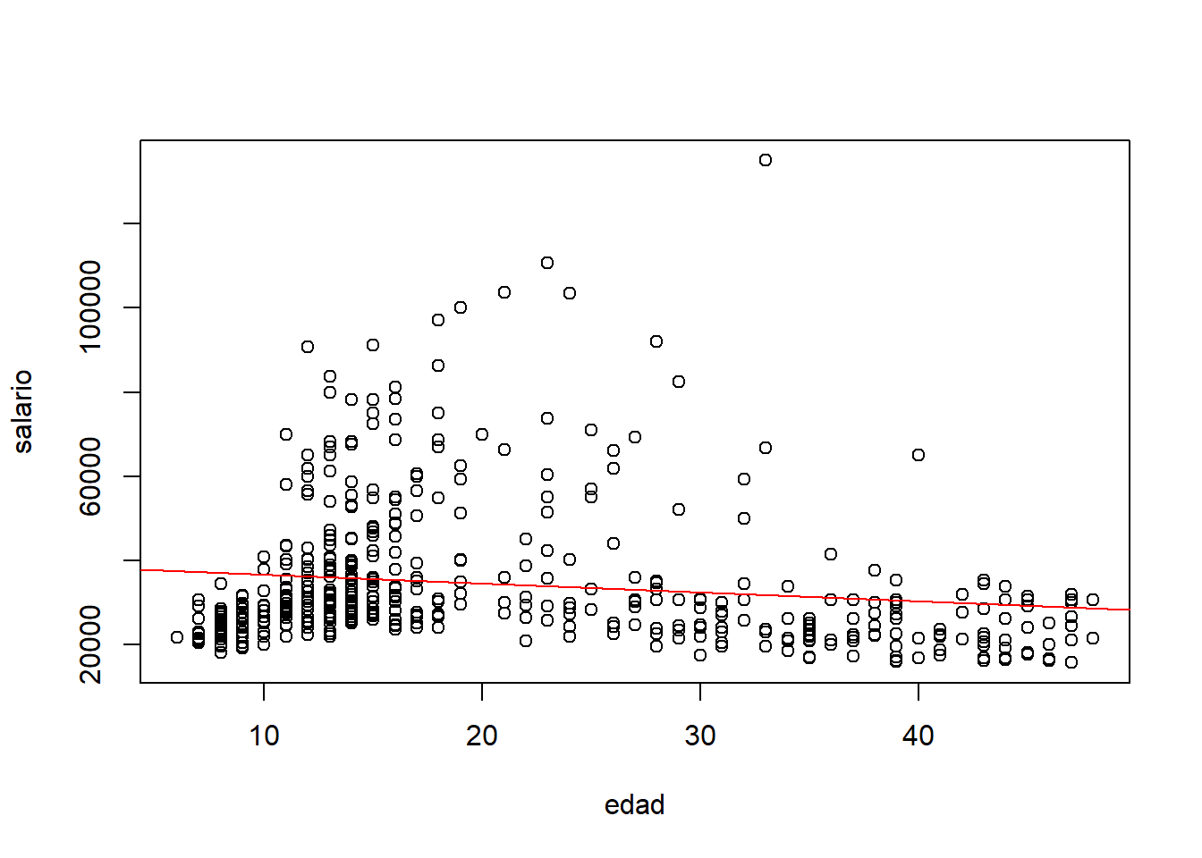 abline(lm(salario ~ edad, data=d), col="red")